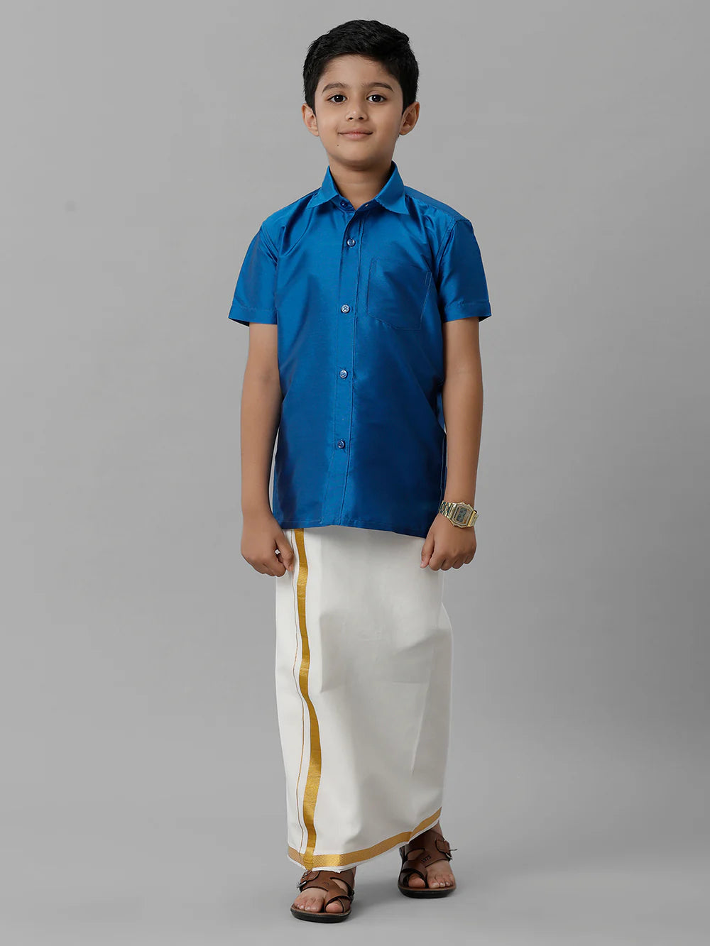 • Persian Blue Colour Boys Golden Zari Border Velcro Dhoti/Veshti/Mundu & Half Sleeve Shirt Set.