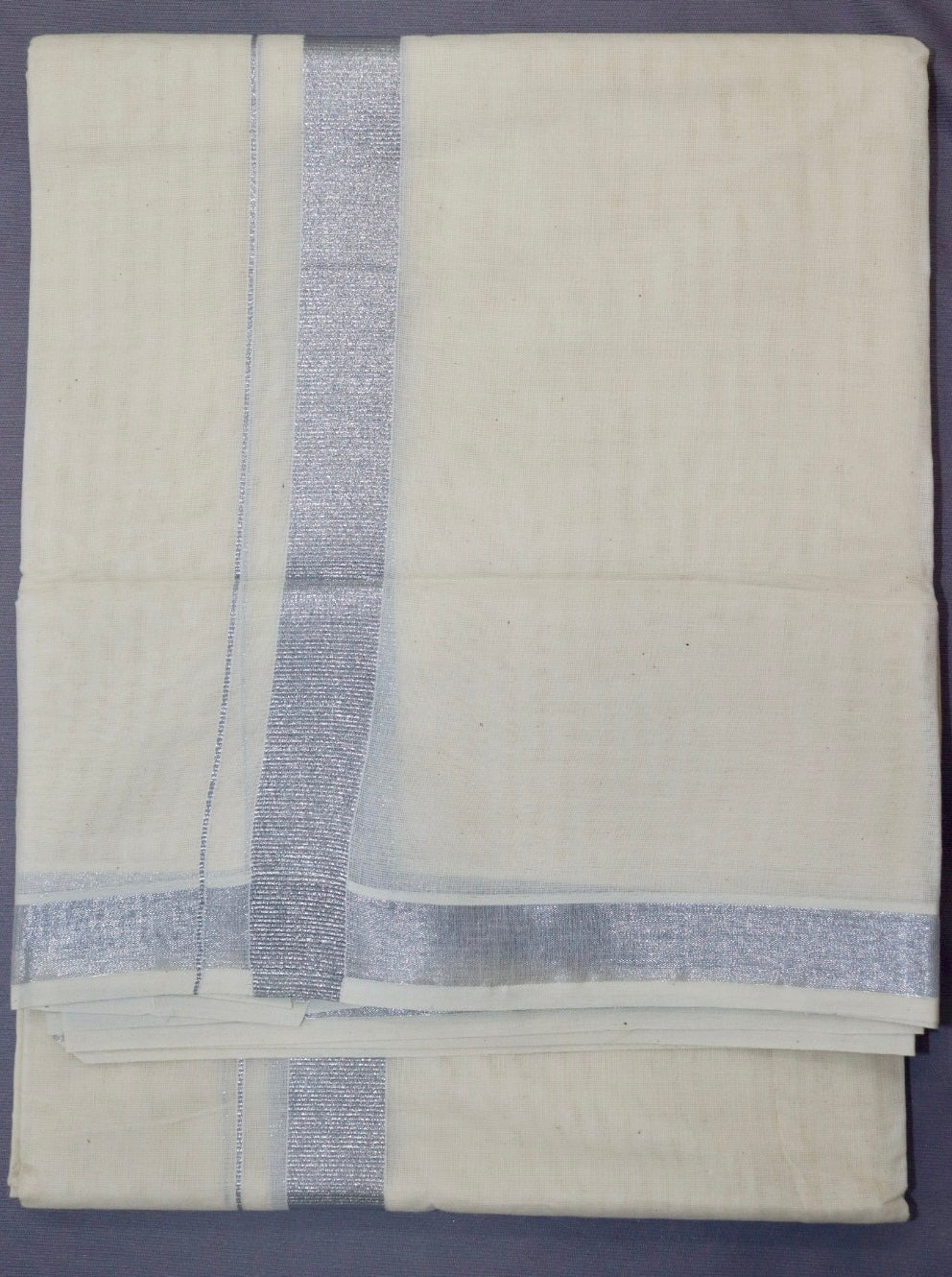 Men's Double Kerala Dhoti/Veshti/Mundu Cream With Silver Zari Border. Made of 100% pure cotton. Suitable for All Hip Size between 28-46.Shop south Indian traditional Dhoti dress online UK.