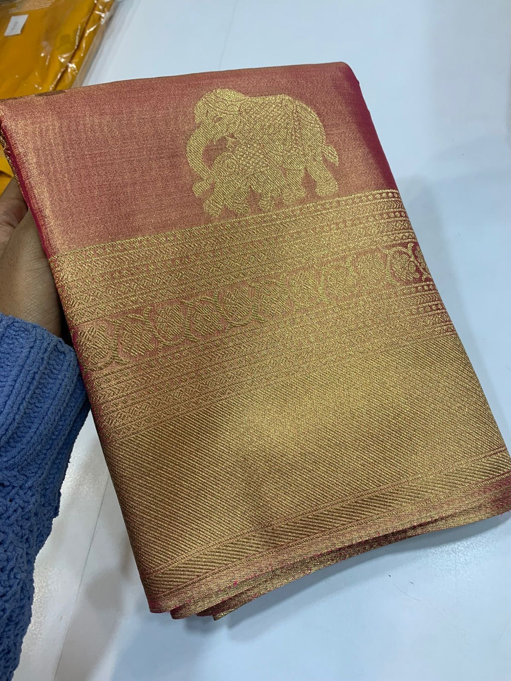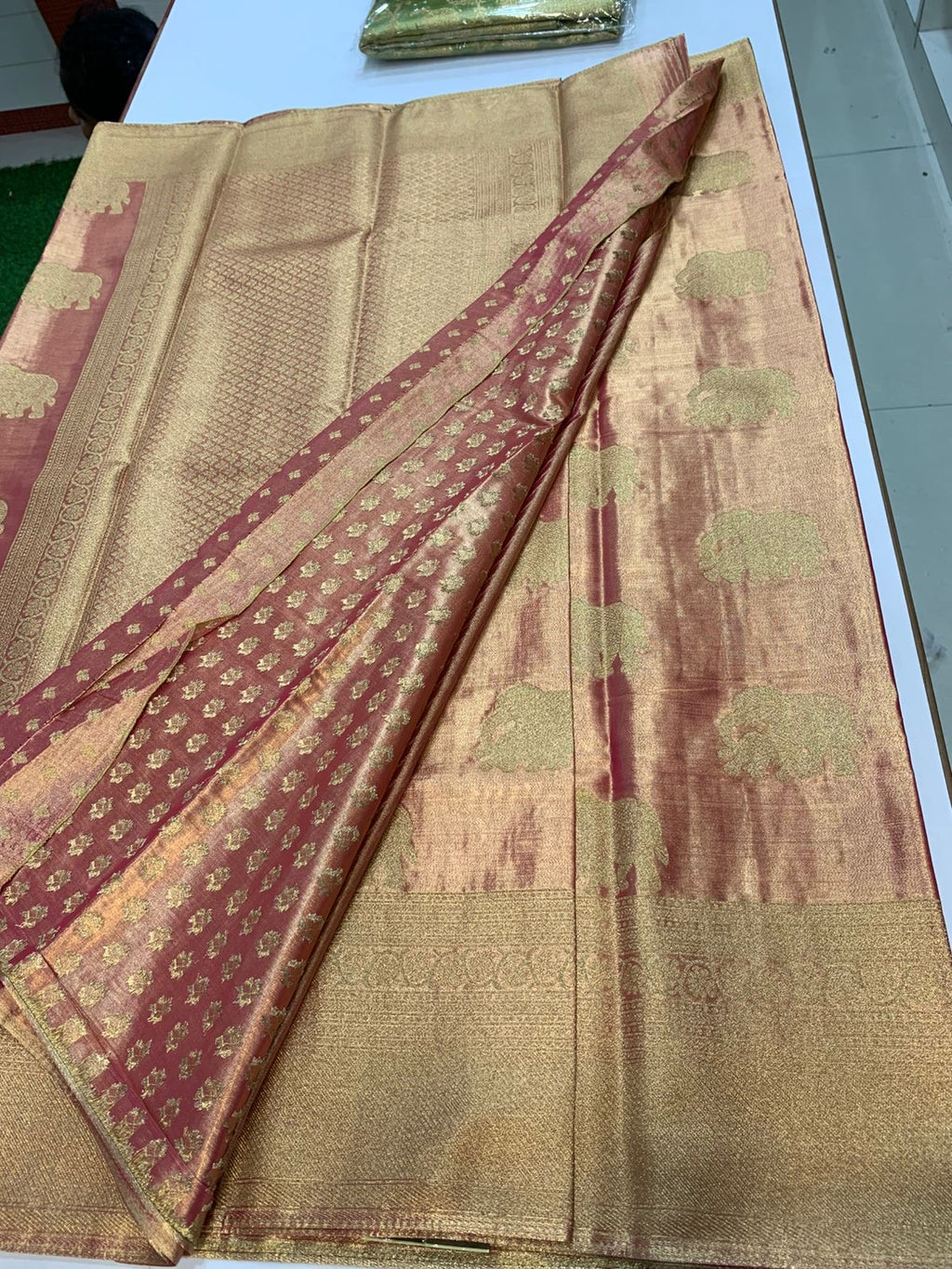 • Design : Golden Zari Woven Elephant Butta all over the Body With Self Zari Border & Zari woven pallu