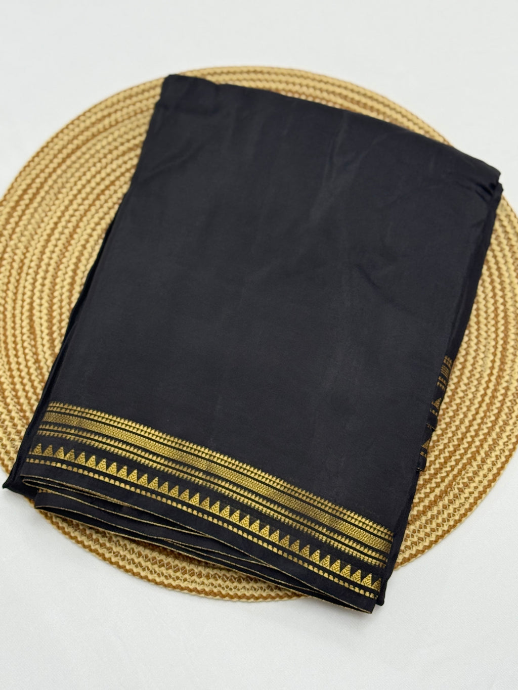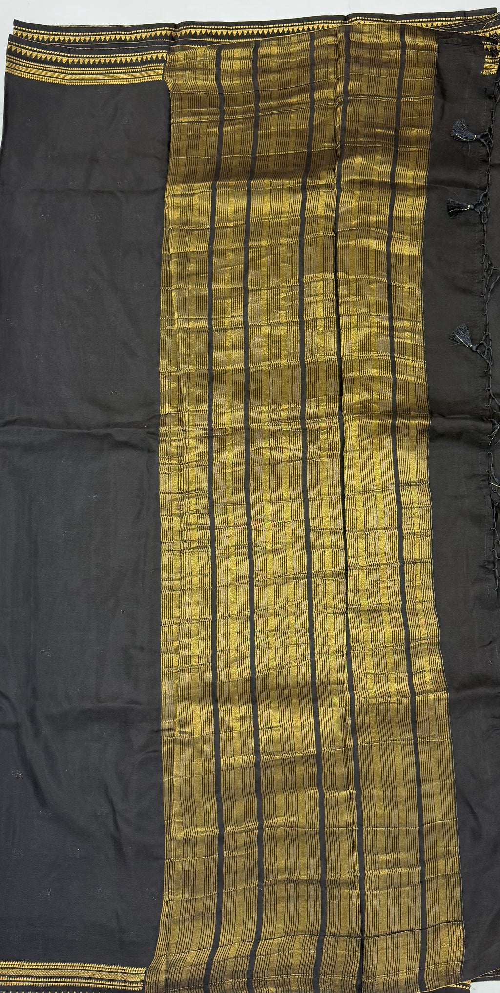 • Design : Plain Body With Unique golden zari woven Border & Self Golden Zari woven vertical striped pallu accomplished with tassels.