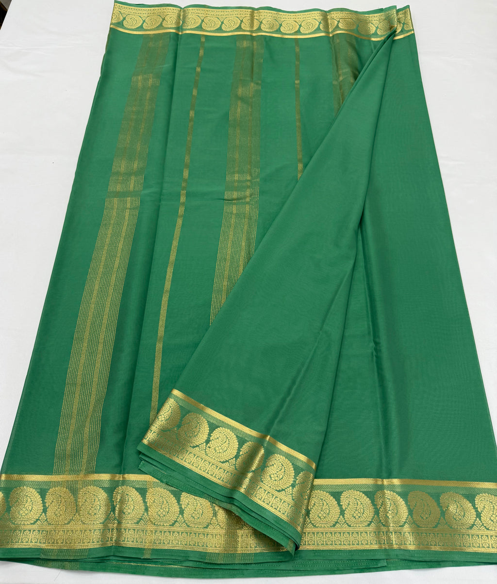 • Design : Plain Body With Unique golden zari woven Border & Self Golden Zari woven vertical striped pallu.