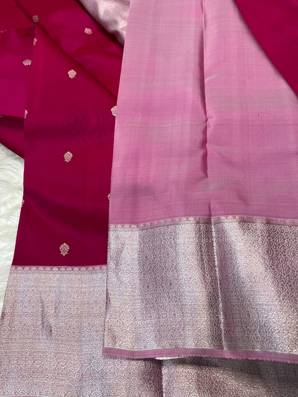 • Saree : A rich Magenta body adorned with elegant Silver zari motifs throughout. The intricate butta design adds a traditional charm to this luxurious silk base, making it perfect for festive and wedding occasions.