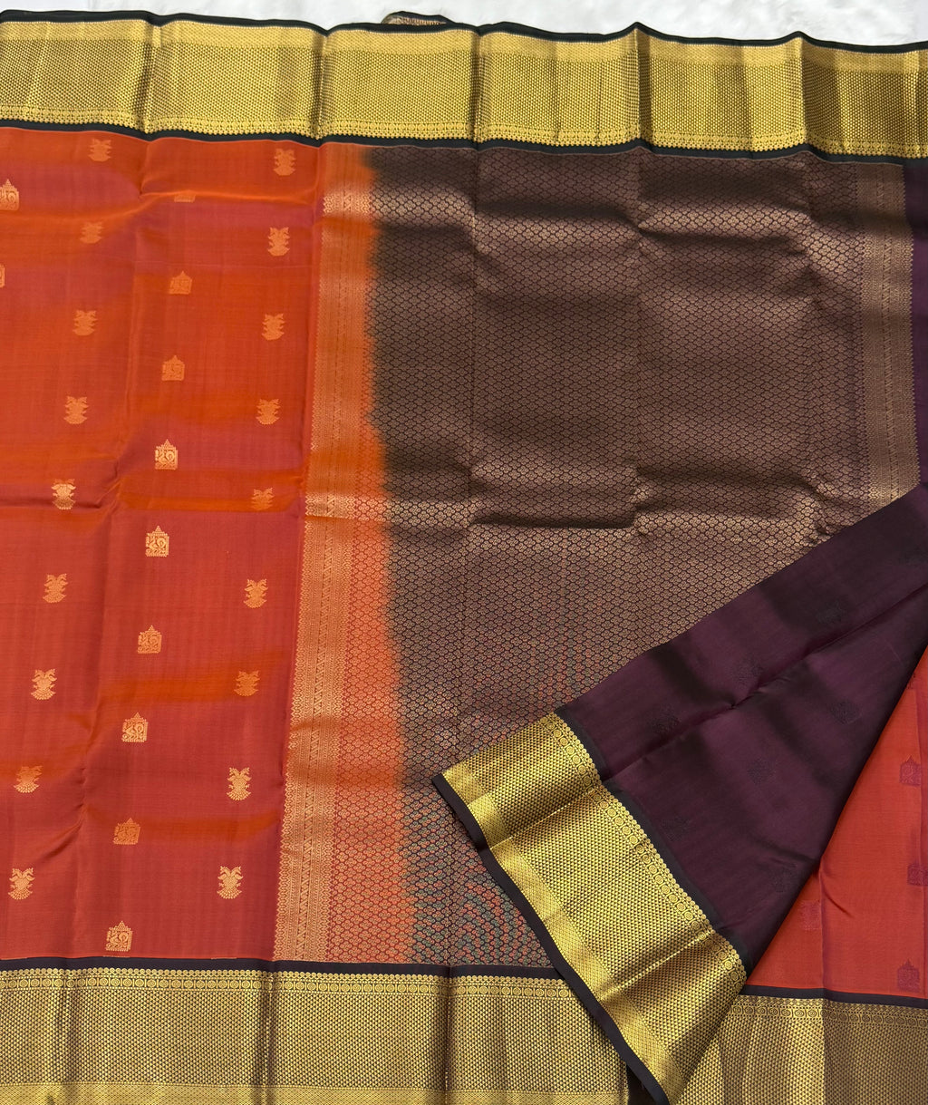 • Saree : A rich Rust Orange body adorned with elegant Golden zari motifs throughout. The intricate butta design adds a traditional charm to this luxurious silk base, making it perfect for festive and wedding occasions.