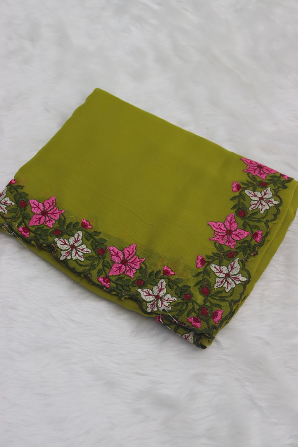 saree and Contrast blouse comes with an elegant embroidery cutwork border, which beautifully compliments the whole attire.