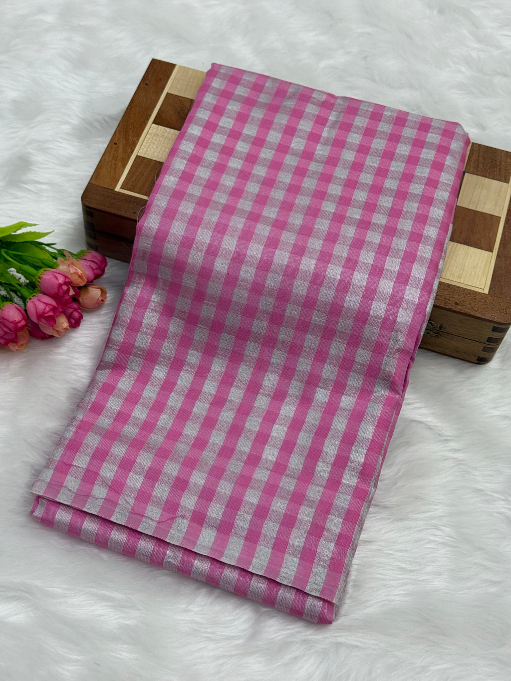 Inspired by the style of the iconic Nayantara Mam, this soft Tissue Silk saree features a rich pallu and Silver Zari woven in a Checked shape for a classic touch comes with a matching blouse. Elevate your wardrobe with this exclusive and luxurious saree, perfect for any special occasion.